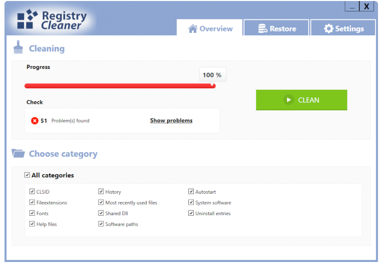 Scan the registry, correct errors and get rid of memory waste, automatically once a month, if desired. Registry Cleaner can detect and correct errors. Your system will become more stable and faster again. Registry Cleaner can detect and correct errors. Your system will become more stable and faster again. Our SmartClean feature protects you by only cleaning and correcting entries that are garbage. None of your working entries will be touched. The registry is the central database of Windows. Unfortunately, many applications and tools write new entries into it both incessantly and without being asked. It does not take long for the registry to become so bloated and desolate that its use slows down the system or even causes it to crash. In short, If the registry is not cleaned up regularly, Windows takes longer to read out urgently needed information. RegistryCleaner is a top modern registry defragmenter that restores orders.