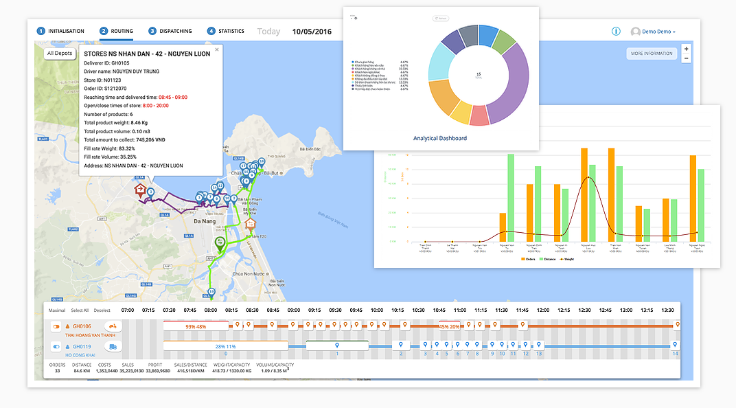 Create tasks for your deliverymen and monitor their delivery progress in real-time. Consumers, Retailers, Distributors choose products, quantity & place orders easily. Like Web App, the Mobile App enables users to track deliverymen and delivery status in real-time. The Consumer Mobile App can be used as a white-label app for your enterprise. Confirmation and tracking for each stage in the process helps improve transparency and avoid fraud. Flexible algorithm considers 30+ constraints like multimodal deliveries, weight volume capacities, time windows... to create the most optimal transportation plan dynamically. Allocate orders to vehicles, optimize length, width, height and visualize the shipment in a 3D interface. Inventory routing minimizes the number of stockouts and save distribution cost. Automatically assign orders with temperature constraints to refrigerated vehicles. Keep track of accurate temperature level, as Abivin vRoute can be integrated with telematics devices.