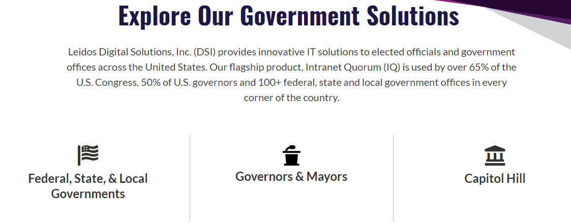 Intranet Quorum (IQ) is the leading communications and process management tool powering the public sector. Proudly serving 65% of the United States Congress, 50% of U.S. Governors and dozens of federal, state and local government agencies in every corner of the country. With over 30 years of service, Leidos Digital Solutions, Inc. is proud to be the market leader in citizen services technology. Our commitment to innovation, ongoing investment in emerging technologies, and dedication to superior customer service has helped us earn, and maintain, a trusted partnership with elected officials and government agencies all over the country. With 100+ federal, state and local government agencies and organizations as our clients, Leidos DSI proudly serves public sector clients from Hawaii to Maine and everywhere in between. We deliver the innovation you expect with experience you can trust.
