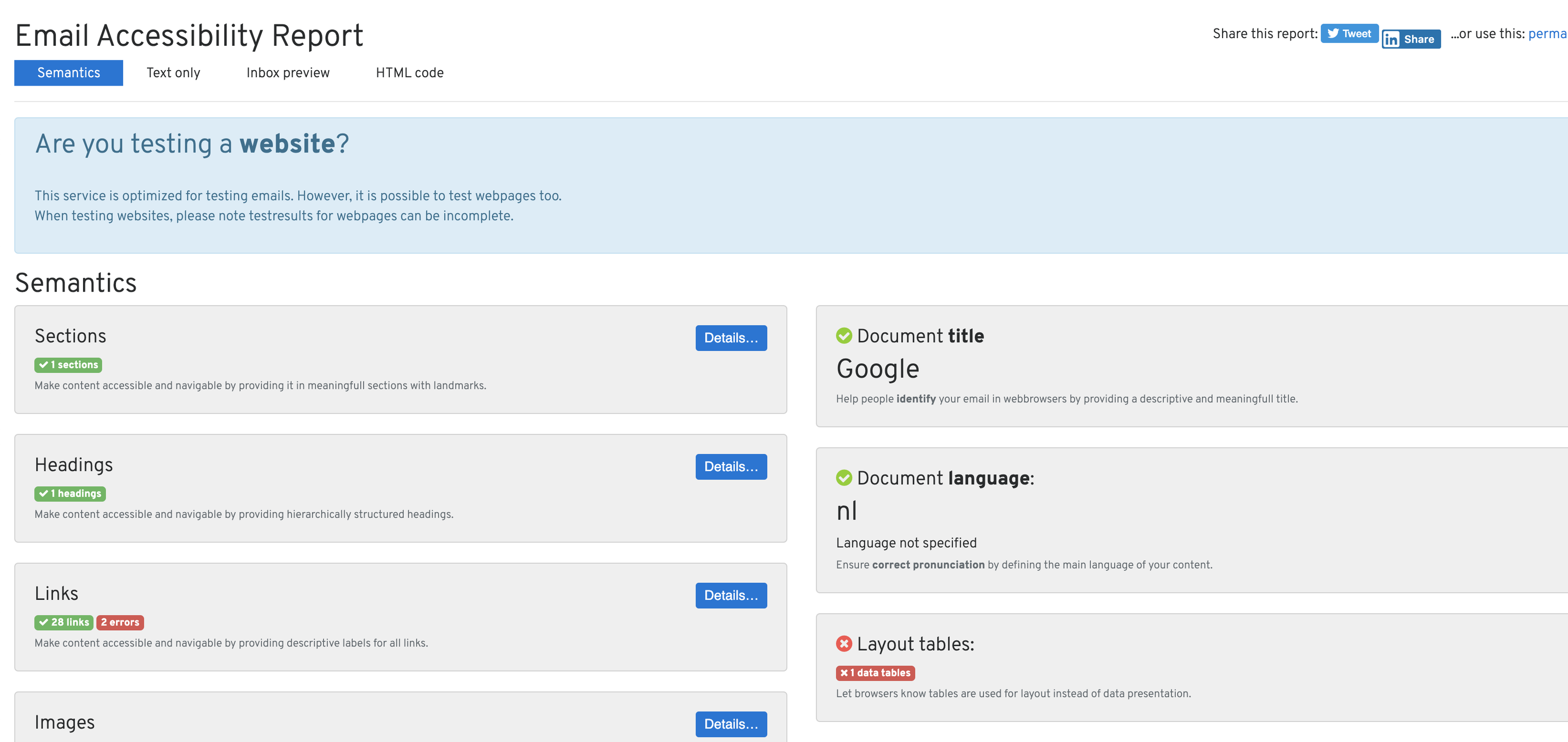It is the mission of Accessible-email.org to promote email marketing accessibility and usability. In that be the voice of users and the email marketing community. For years the email marketing industry has never really made a point of accessibility. But a large section of email recipients does care and need accessible email. With the current maturity of the channel, it should be totally possible and new devices, email clients and coding techniques demand better accessibility. We believe it is the right time to get more serious about the topic to keep the channel open for the future. The accessibility evaluation tool is the first of our projects. It is aimed at email marketing professionals and industry developers to give them an overview of their current level and possible improvements.