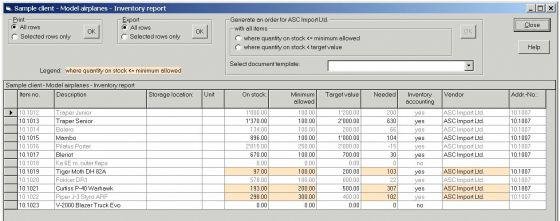 You can print, export as .rtf or .txt files, and directly email the documents that you have generated. You can manage your inventory and you can generate order documents (including purchase orders) automatically using the inventory accounting function.