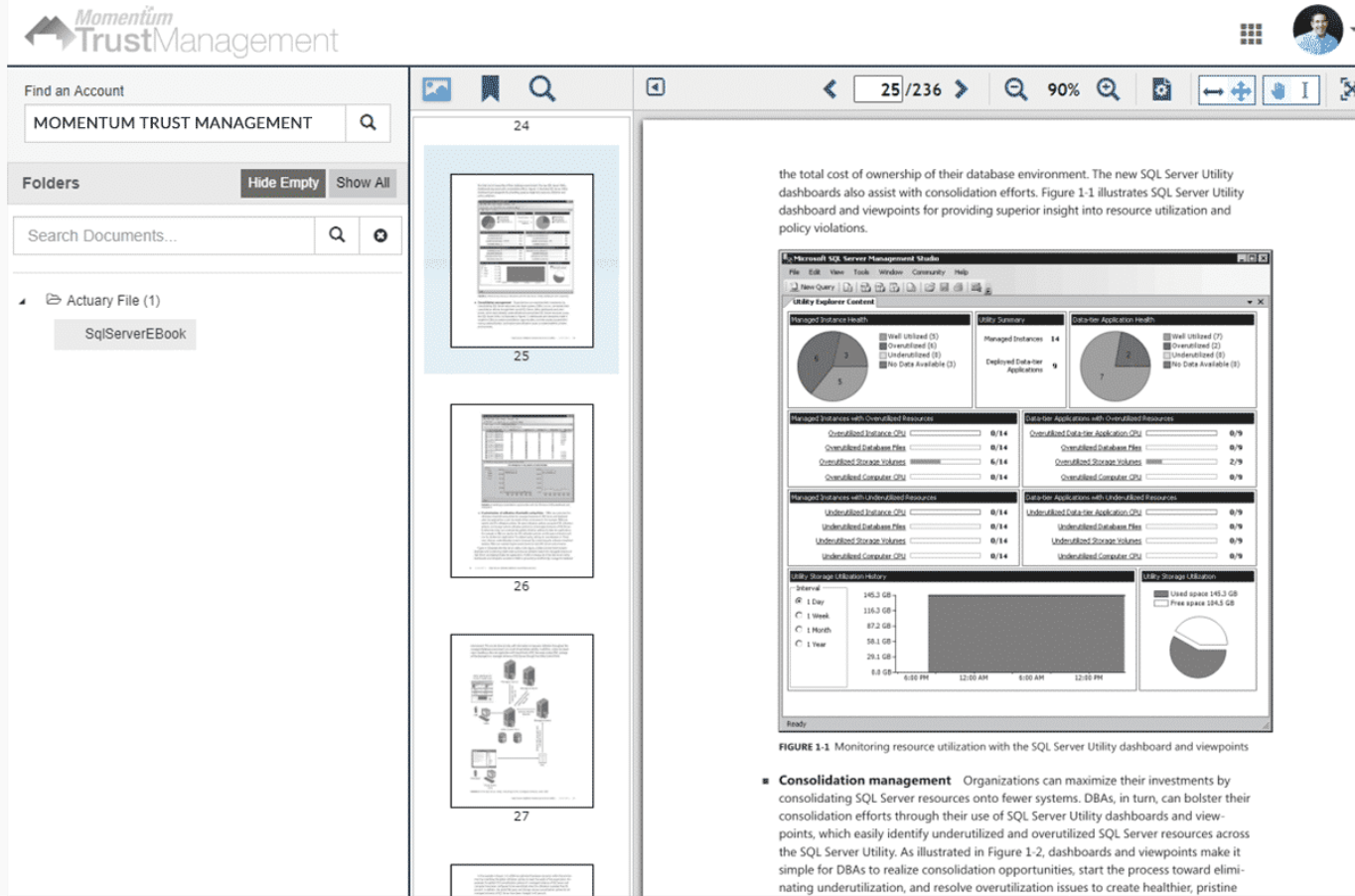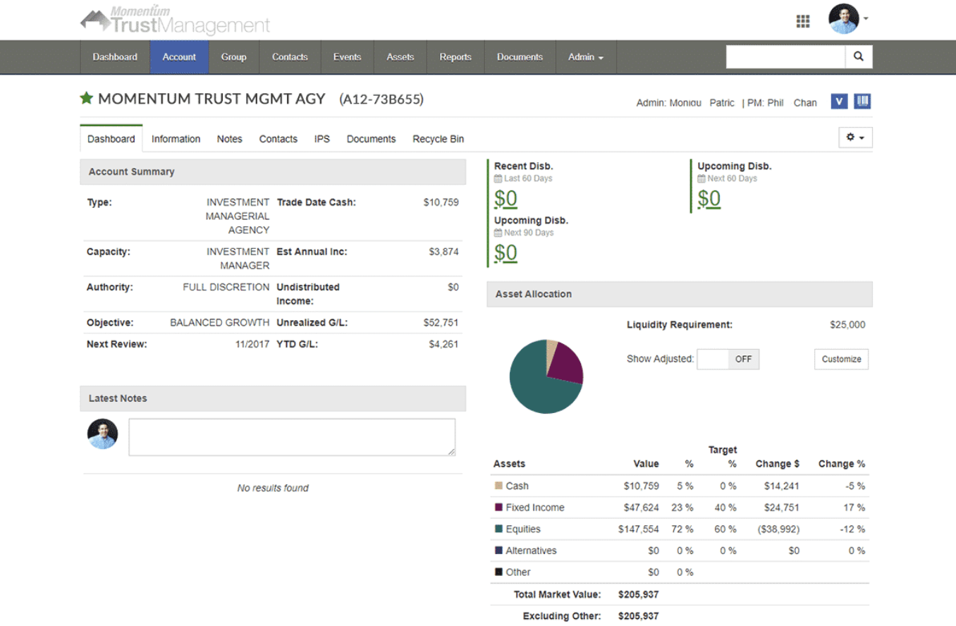 When you log into MomentumTRUST you are presented with a dashboard displaying real-time portfolio snapshots of key account factors. The dashboard is designed to help you strategically plan your day. Integrated with trading software, the dashboard pulls transactions and pricing to provide users with real-time valuations of all customer accounts. The social network style lets users leave notes on almost any entity and track those over time. MomentumTRUST’s built-In CRM+ allows you to efficiently track and connect prospects, accounts, households, beneficiaries, grantors and third-party relationships related to trust management. Whether you are in the office or on-the-go, easily review and respond to client requests with MomentumTRUST’s portfolio analytics tools. MomentumTRUST’s secure, in-system scanning and storage allows your business to easily organize, file and retrieve documents in a cloud-based environment.