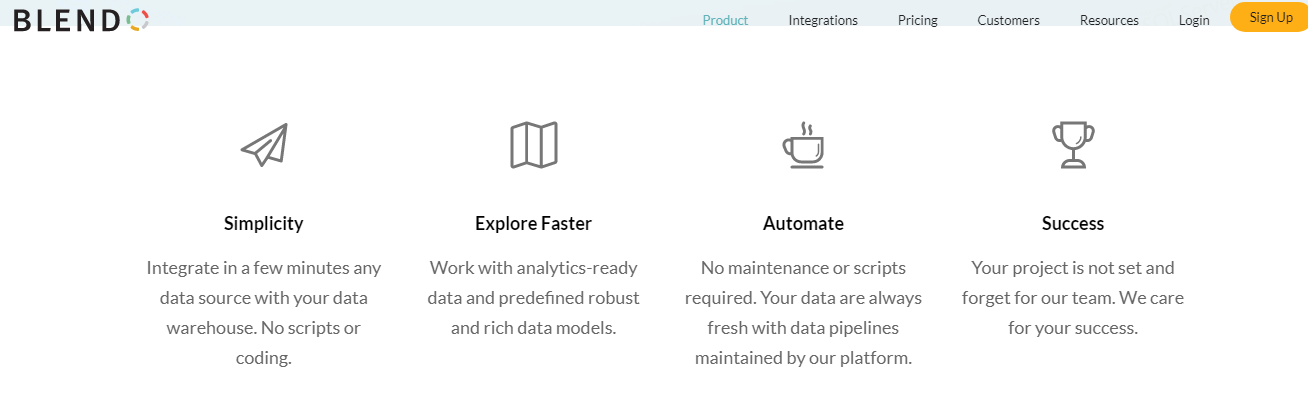 Blendo is the leading ETL and ELT data integration tool to dramatically simplify how you connect data sources to databases. With natively built data connection types supported, Blendo makes the extract, load, transform (ETL) process a breeze. Automate data management and data transformation to get to BI insights faster. Data analysis doesn’t have to be a data warehousing, data management, or data integration problem. Automate and sync your data from any SaaS application into your data warehouse. Just use ready-made connectors to connect to any data source, simple as a login process, and your data will start syncing right away. No more integrations to built, data to export or scripts to build. Save hours and unlock insights into your business. Accelerate your exploration to insights time, with reliable data, analytics-ready tables and schemas, created and optimized for analysis with any BI software.