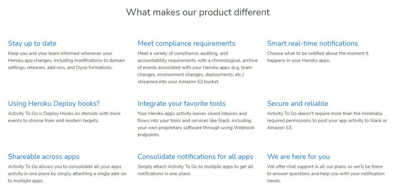 Get notified when your Heroku app changes. Real-time updates on what's happening in your Heroku apps, in Slack. Keep you and your team informed whenever your Heroku app changes, including modifications to domain settings, releases, add-ons, and Dyno formations. Meet a variety of compliance, auditing, and accountability requirements with a chronological, archive of events associated with your Heroku apps (e.g. team changes, environment changes, deployments, etc.) streamed into your Amazon S3 bucket. Choose what to be notified about the moment it happens in your Heroku apps. Activity To Go is Deploy Hooks on steroids with more events to choose from and modern targets. Your Heroku apps activity leaves siloed inboxes and flows into your tools and services like Slack, including your own proprietary software through using Webhook endpoints. Activity To Go doesn't require more than the minimally required permissions to post your app activity to Slack or Amazon S3.