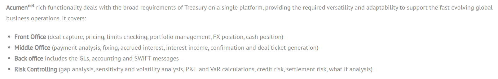 Acumen-net is a central trading solution for dealers. Transactions can be directly entered (phone transactions) or automatically imported from various trading platforms (Reuters FXT, Bloomberg, etc.). Acumen-net is providing all the necessary calculations, limits checking and position monitoring. Simulations at pre-trade level offer the perfect decision support tool, with indicators on the deal profitability and risk, as well as its impact on portfolios. All market prices, rates and volatilities can be retrieved real-time from information providers. Various blotters allow dealers to monitor their position and P&L on various instruments, in real-time, while dedicated modules allow the Middle Office operators to follow up the various steps of the deal life cycle. Acumen-net is also used as an Order Management solution. Login SA’s leading product, Acumen-net, has been designed to support all financial market transactions.