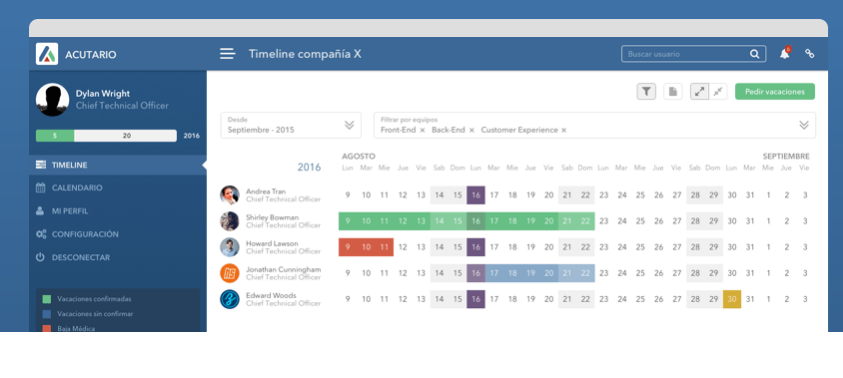 Forget about spreadsheets, complex applications or handwritten requests. Acutario is a cloud application to manage holidays, absences and sick leaves. Filter by date and/or team to see your team's disponibility at a glance. Assign your organization's users in groups and teams dynamically. Different configurations of holidays and per-year free days can be defined for each user. Absence requests must be approved by the managers of each team. If your company uses Google Apps, you can use the same user accounts and calendars thanks to our integration with Google. Using iCalendar standard (.ics, .ical) you can suscribe to absence calendars using any compatible calendar service or application. When a user request an absence, the days are marked at the calendar and it's managers are notified. Using the timeline, managers can easily decide if a user can take it's time off or not. All the people involved is notified and the time off days are marked on the organization's calendar.