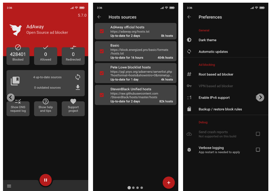 AdAway is an open-source ad blocker for Android using the host's file. AdAway is fully open and licensed under GPLv3+. Easily add your own sources of hosts files! Add exceptions to your whitelist, blocklist and rules for redirects! AdAway will not work reliably when on Mobile Networks like 3G. You can deactivate that proxy by going to your selected APN and removing the value in the proxy field. Enable the local Webserver in AdAway’s preferences as a workaround. Add redirection lists to your host's sources to redirect blocked DNS requests to the correct IPs in China. This hosts source contains redirection rules for Google, Facebook, and other. For devices older than Android 8 Oreo, use version 4 of AdAway.
