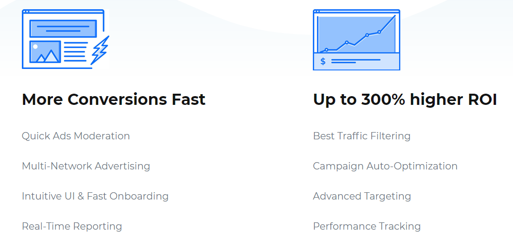 More conversions. Fast quick Ads moderation. Multi-network advertising. Intuitive UI and fast onboarding. real-time reporting. Pop, native, banner, video, pushes. Traffic from most popular platforms: iOS, Android, Windows, Mac OS. Web, mobile web and In-App inventory from the best sites and apps. High quality traffic sources. 20 billion ad impressions available daily from top publishers, ad networks, exchanges and SSPs. Monetize your website or mobile application with our SSP. Let the team of monetization experts deliver the best results possible. Supercharge your advertising business with advanced and reliable White Label DSP and SSP solutions. Set your own logo, icons. Use custom JS and CSS, Choose preferable payment methodsAd exchange, Set budget settings, multi-level account types, multiple promotion chanelsSupport team, dedicated Support Team, migration helpDomains.
