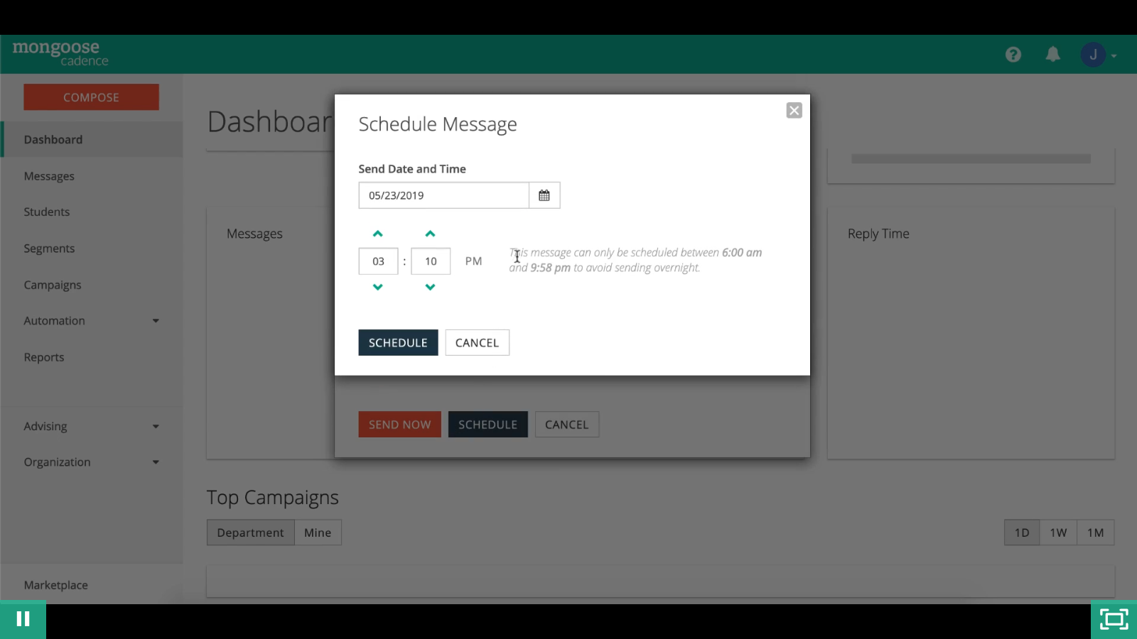 Cadence. The premier texting platform, meticulously designed to help your campus make instant, meaningful connections. Yes, it works with your current systems. Simple yet powerful. Cadence allows staff to efficiently reach students and alumni in their preferred communication channel – texting. With time-saving features like campaigns, auto-responses, templates, and shared inboxes, your team can work smarter, not harder. Built for the enterprise – and everyone. Cadence easily scales to deliver undeniable results for institutions and departments of all shapes and sizes. Enterprise. Achieve campus wide engagement Enrollment. Connect with prospective students. Student Success. Increase retention with current students. Advancement. Improve alumni relations, stewardship, and donations. Any device, any time. Thanks to the flexibility of managing messages through any web browser or the Cadence mobile app, staff will always be in a position to engage with contacts and inspire action.