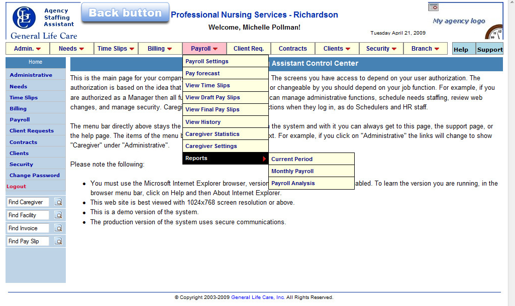 You can run your business from anywhere you have access to the Internet world wide with availability when you need or want it with this medical staffing software. No more lost documents or misplaced information when it’s needed at a critical time. No special hardware to purchase and no software to load and constantly update. Information kept in a secured environment and backed up frequently on a daily basis. Monitors license expirations, health requirements 24 hours a day every day of the year. This protects your company from sending your employees to work some place with expired or improper credentials. No limits on number of individuals you allow to access the system. Furthermore, we also do not charge you for this capability like others do. Before you commit to some long-term contract and hefty charges, check us out as we don’t require a contract and you only pay for what you use each month. Others get a fixed amount even if you don't make money.