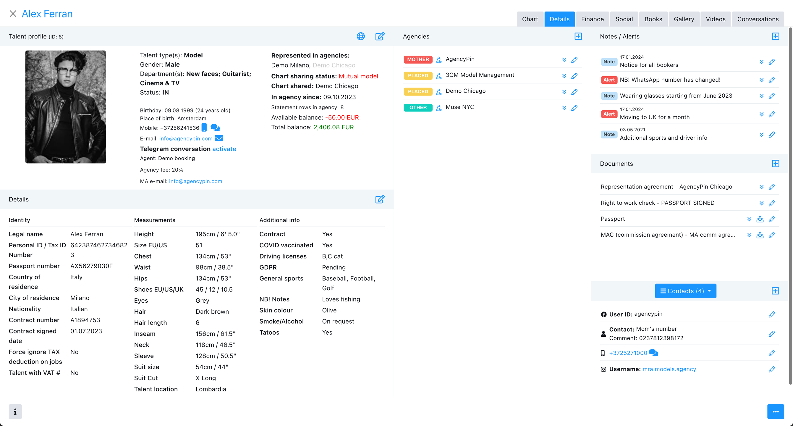 See model balances, generate reports, create model payments, print checks and statements and much more. Keep track of all your booking and scouting management, focus on growing your business. Manage talent bookings, statements, image and video galleries, notes, documents, social life and much more.