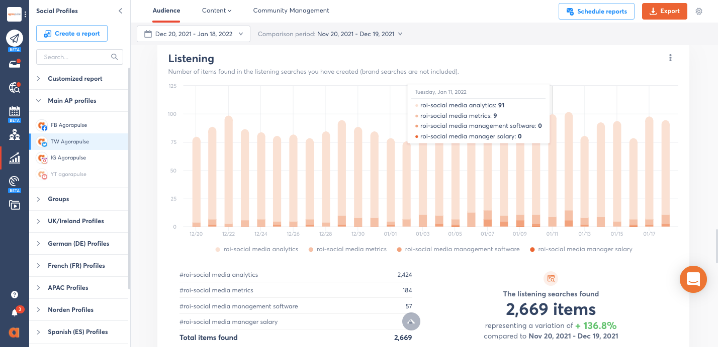 Agorapulse currently supports Facebook, Instagram, TikTok, Twitter, LinkedIn, Google My Business, and YouTube accounts.