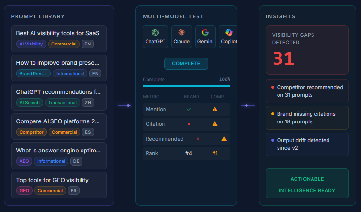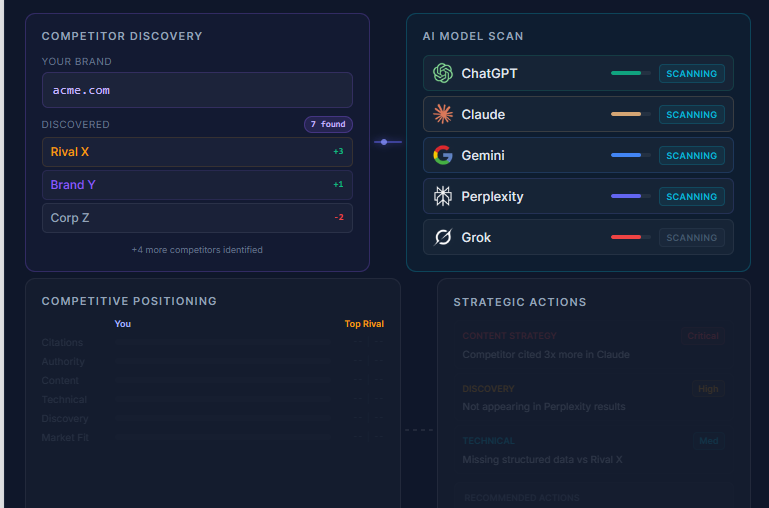 Akii is an AI search intelligence and visibility optimization platform designed to help businesses understand and improve how their brand is represented across AI-powered systems such as ChatGPT, Gemini, Claude, Perplexity, and Microsoft Copilot. It continuously monitors how these models interpret, rank, and recommend a brand, providing real-time insights into visibility, authority, and overall perception within AI-generated responses. It includes tools such as AI visibility tracking, brand audits, competitor intelligence, and website optimization, enabling teams to identify gaps, risks, and opportunities that affect how their content is discovered and cited. By analyzing live AI outputs rather than traditional search rankings, Akii reveals which competitors are being recommended, why they are favored, and how positioning shifts over time. It also delivers prioritized, impact-based actions that help teams improve discoverability and refine content.