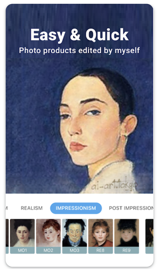 AI Gahaku is a free photo editor cam app that transform your selfies into a Renaissance portrait paintings. Using AIGahaku’s art filters you can make your photo look as if Warhol pop art, Modigliani oil painting, Picasso, or even Rembrandt himself painted it for you! And with no picture editing or Photoshop skills needed, it’s easy to share your world. You'll find more than 300 art styles in AIGahaku art filter library. AIGahaku has the largest collection of different artistic styles to choose from.