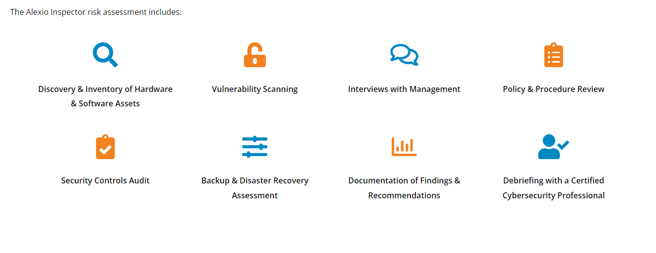Alexio™ Inspector was specifically designed for healthcare practices to find IT security gaps and vulnernabilities and provide recommendations on how to fix them. Even if you have an IT company currently monitoring your network, our 3rd party assessment will allow you to see how well they’ve protected you and identify blind-spots. An annual security risk assessment is the best way to keep data safe from ransomware, hacking, data theft, and employee mistakes. Alexio inspector always finds security gaps, and that's the point. Find and fix the gaps before you become a victim. Get a full report of your hardware, software, backup, and network status. Plus, you'll get a risk management plan consultation with a Certified Cybersecurity Professional. Thorough check of hundreds of system parameters, vulnerabilities, risks, and specifications.