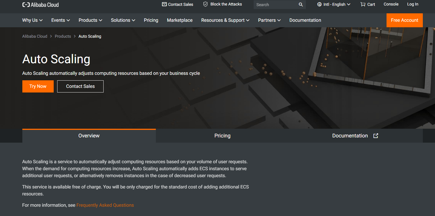 Auto Scaling is a service to automatically adjust computing resources based on your volume of user requests. When the demand for computing resources increase, Auto Scaling automatically adds ECS instances to serve additional user requests, or alternatively removes instances in the case of decreased user requests. Automatically adjusts computing resources according to various scaling policies. Supports manual scale-in and scale-out, which offer you flexibility to control resources manually. During peak periods, automatically adds additional computing resources to the pool. When user requests decrease, Auto Scaling automatically releases ECS resources to cut down your costs
