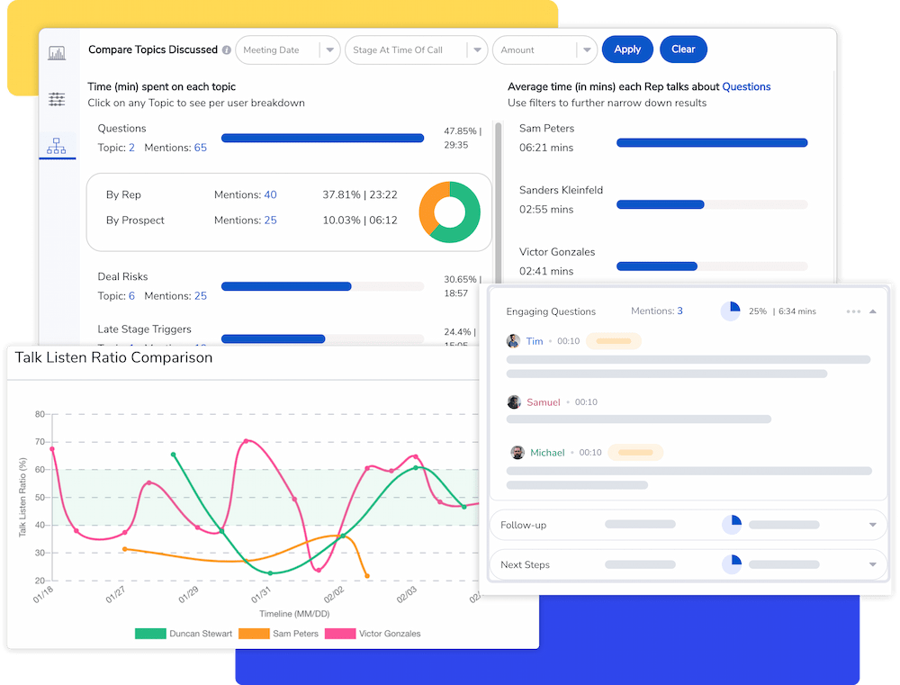 Understand how customers are really engaging with your reps in sales conversations. Then turn them into Revenue. Captures and understands who said about what in your customer calls, and delivers insights that help increase predictable revenue. Let’s face it. Customers have many things on their mind. Know what topic matters to them so you can better guide your conversations. Captures calls, transcribes with state of the art AI transcription, figures out who asked what, when, about what, and organizes it with deals, accounts, prospects. Understands interactions by prospect/rep, tags and summarizes by topic, captures KPIs and contrasts topic patterns that move deal through stages. Connect critical KPIs such as deal risks and other topic patterns by stage, rep to revenues. Use insights to build successful sales teams and predictable revenue. Top closers engage in subtle ways that make them who they are.