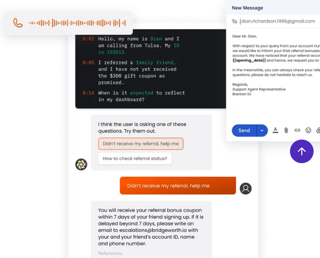 Delight customers in every conversation, all the time. Our AI-driven workflows make it happen 99.9% of the time. Circling through multiple tabs just to understand what you offer. Sitting in sales calls, listening to a pitch that isn’t relevant to them. Searching your FAQ for answers to their problems endlessly. Losing valuable time as they wait for your team to find a solution. Use Alltius’ AI agents to delight your customers with experiences that leave them amazed after every conversation. Enable your customers to find information, solve problems or take action, autonomously, with just a simple empathic conversation. Customers receive tailored demos that match their unique needs, get instant answers during calls, and receive relevant follow-ups, turning a potential "maybe" into a resounding “yes”. Provide your customers with instant resolutions on every call, offering personalized responses across any channel, available.