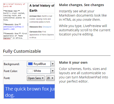 MarkdownPad is a full-featured Markdown editor for Windows. Instantly see what your Markdown documents look like in HTML as you create them. While you type, LivePreview will automatically scroll to the current location you're editing. Markdown formatting can be applied (and removed) with handy keyboard shortcuts and toolbar buttons. You don't need to know anything about Markdown to use MarkdownPad! Color schemes, fonts, sizes and layouts are all customizable so you can turn MarkdownPad into your perfect editor. Change the look of your HTML documents by using your own CSS stylesheets. MarkdownPad supports multiple stylesheets and has a built-in CSS editor. The default CSS is beautiful and minimal, and will make your HTML documents look great. Quickly create ready-to-use HTML documents, or simply copy a portion of your document as HTML. MarkdownPad Pro supports multiple Markdown processing engines, including Markdown Extra (with Table support), and GitHub Flavored Markdown.
