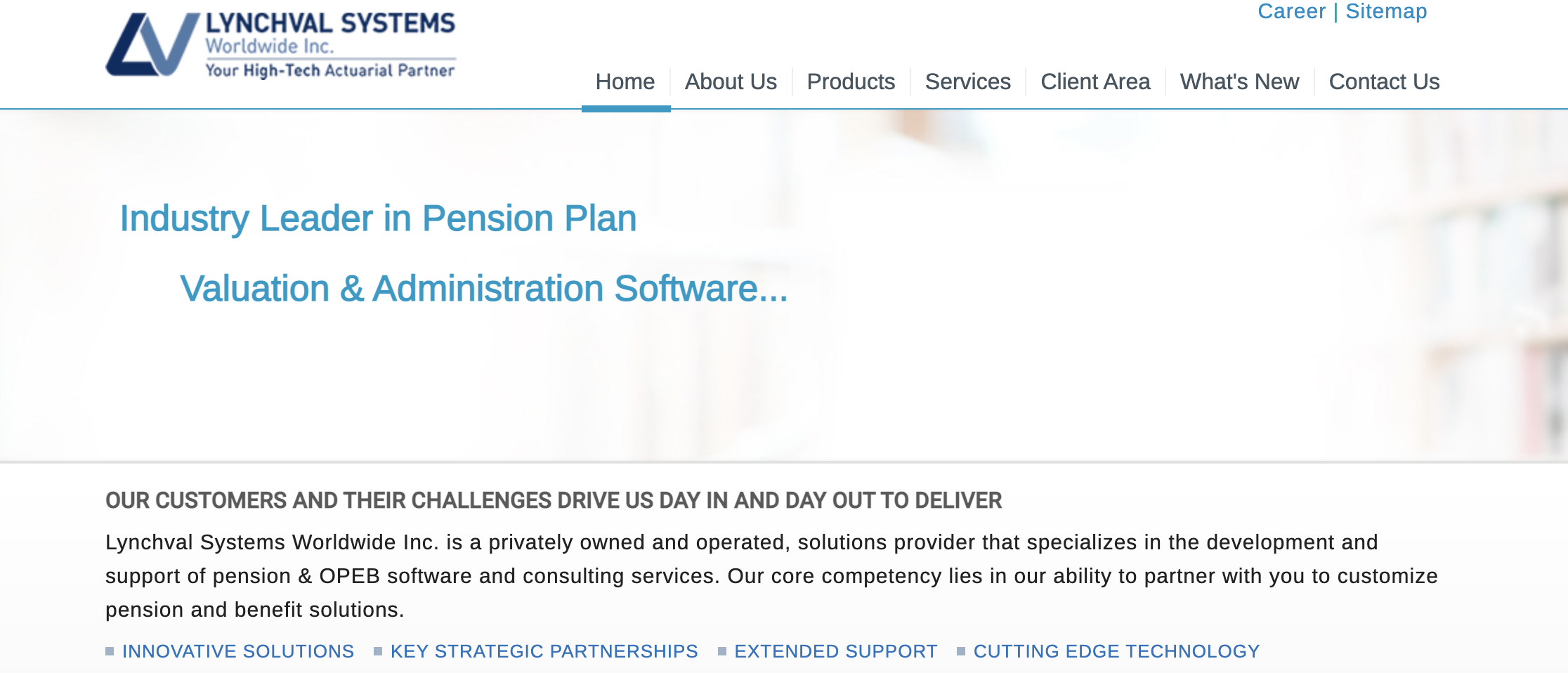 Lynchval Systems Worldwide Inc. is a privately owned and operated, solutions provider that specializes in the development and support of pension & OPEB software and consulting services. Our core competency lies in our ability to partner with you to customize pension and benefit solutions. Unique product architecture with leading edge programming capability that allows for coding any and every complex plan provisions on our platform. We specialize in customizing the features of our software to fit our client's needs. Customization can be as small as adding additional options to existing features to creating a client specific interface, customized reports, or client specific calculation modules. Our products are scalable, designed to handle high or low volumes of participants with calculation speeds clients both need and desire.