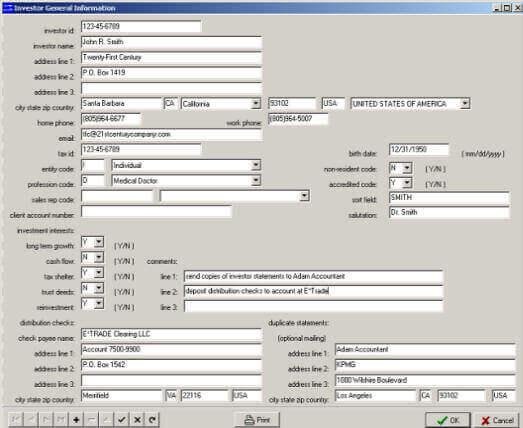 Hedge Fund Software calculates the allocation of distributions to investors, tax return schedule k-1s, distribution checks, broker commissions and management reports. Allocation of Management Fees and Partnership Expenses to Investors. Customized professional-looking color Investor Statements with the partnership logo, name, address and phone. Customized allocation formulas based on guaranteed return, high watermarks, and other incentive factors. The new Windows Version runs on an office computer network with remote access available via the internet. Fund Investment Tracker Software tracks hedge fund investment portfolios in stocks, bonds, commodities, and other assets. The spreadsheet format allows fund managers to quickly view the status of investments including symbol, description, quantity, total cost, average cost, current price, market value and gain( loss) percentage.