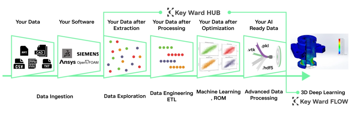 Extract, transform, manage, & process CAD, FE, CFD, and test data effortlessly. Create automatic data pipelines for machine learning, ROM, & 3D deep learning. Removing data science barriers without coding. Key Ward's platform is the first end-to-end engineering no-code solution that redefines how engineers interact with their data, experimental & CAx. Through leveraging engineering data intelligence, our software enables engineers to easily handle their multi-source data, extract direct value with our built-in advanced analytics tools, and custom-build their machine and deep learning models, all under one platform, all with a few clicks. Automatically centralize, update, extract, sort, clean, and prepare your multi-source data for analysis, machine learning, and/or deep learning. Use our advanced analytics tools on your experimental & simulation data to correlate, find dependencies, and identify patterns.