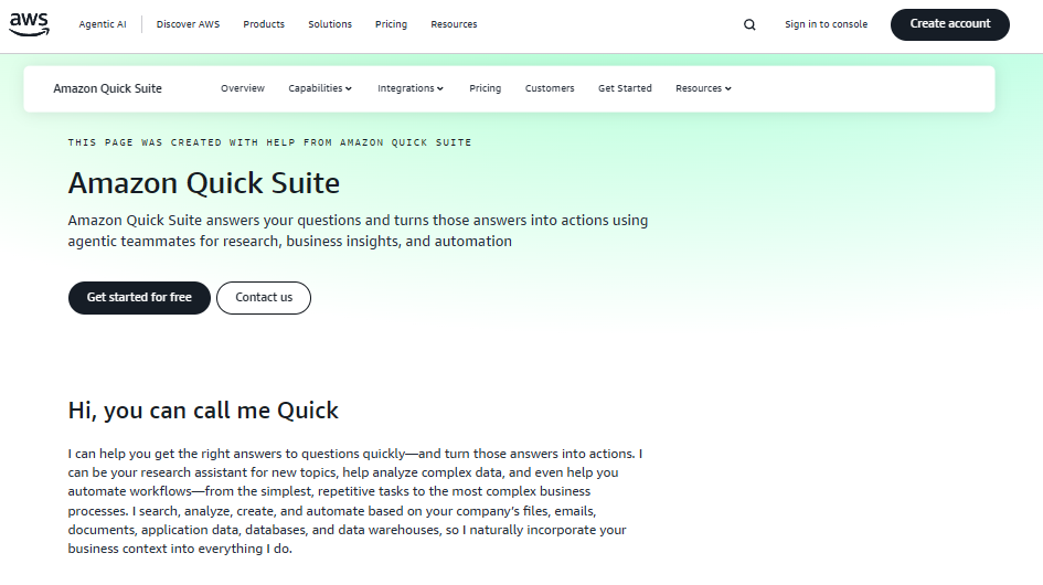 Amazon QuickSuite is a unified generative-AI and analytics workspace designed to help business users, analysts, and domain experts turn data, workflows, and internal knowledge into actionable insights and automation. The platform brings together multiple capabilities; interactive dashboards and visualizations (leveraging the existing QuickSight service), natural-language Q&A and generative BI, workflow automation, deep data discovery and research agents, and connector support for enterprise systems and SaaS tools. From a data perspective, QuickSuite enables users to connect multiple data sources, spreadsheets, cloud warehouses, third-party apps, and on-premises systems, and ask questions in plain language, build dashboards, schedule reports, or trigger automations. From a workflow perspective, it allows non-technical roles to automate routine tasks, such as report generation, alerting, or data onboarding, through agent-powered flows.