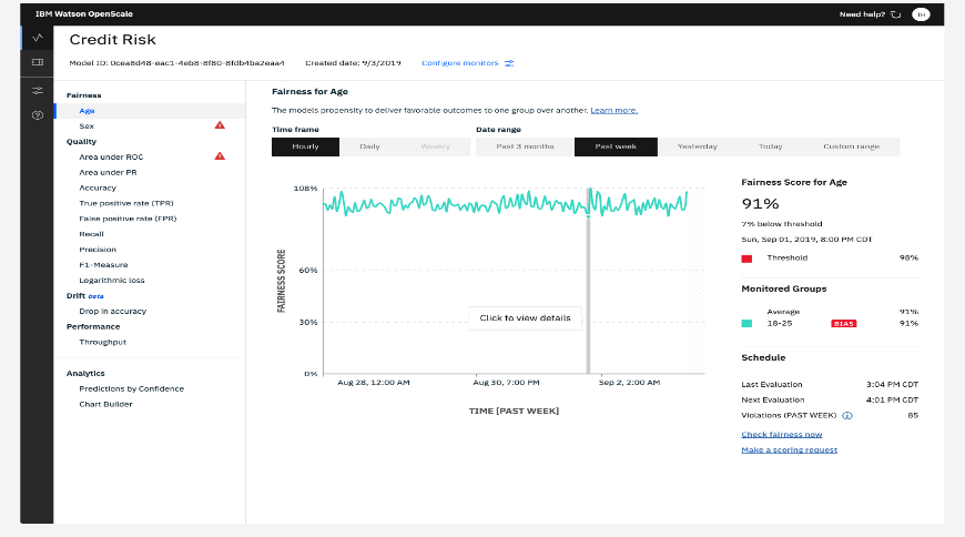 IBM Watson OpenScale is an enterprise-scale environment for AI-powered applications that provides businesses with visibility into how AI is created and used, and how ROI is delivered. IBM Watson OpenScale is an enterprise-scale environment for AI-powered applications that provides companies with visibility into how AI is created and used, and how ROI is delivered at the business level. Create and develop trusted AI using the IDE of your choice and power your business and support teams with data insights into how AI affects business results. Capture payload data and deployment output to monitor the ongoing health of business applications through operations dashboards, alerts, and access to open data warehouse for custom reporting. Automatically detects when artificial intelligence systems deliver the wrong results at run time, based on business-determined fairness attributes. Mitigate bias through smart recommendations of new data for new model training.