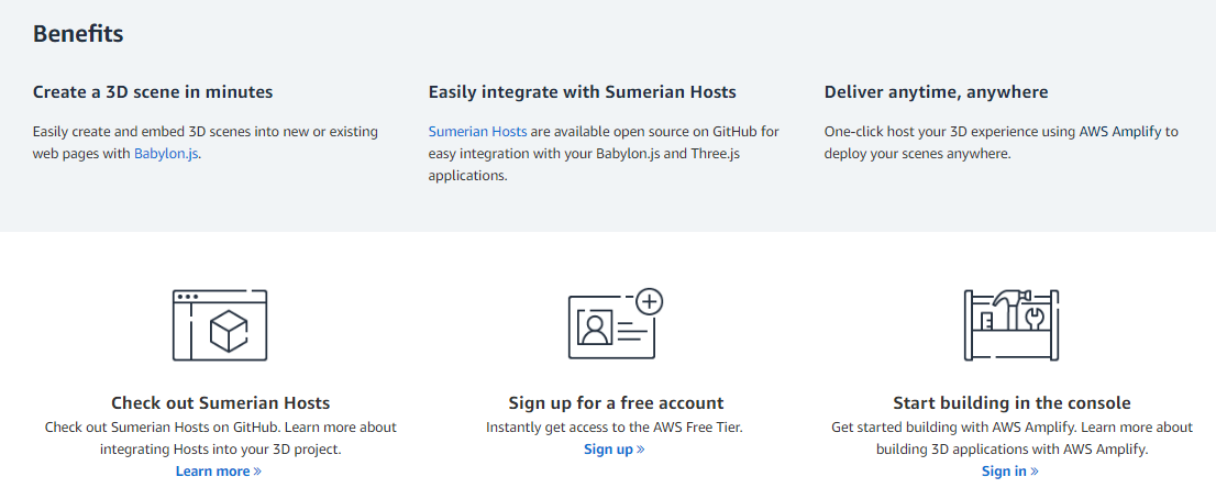 Bring a new dimension to your web and mobile applications with Amazon Sumerian. 3D immersive experiences are breathing new life into user experiences on the web, increasing customer engagement with brands and improving productivity in the workplace. Amazon Sumerian makes it easy to create engaging 3D front-end experiences and is integrated with AWS services to provide easy access to machine learning, chatbots, code execution and more. As a web-based platform, your immersive experiences are accessible via a simple browser URL and are able to run on popular hardware for AR/VR. One-click host your 3D experience using AWS Amplify to deploy your scenes anywhere. Sumerian Hosts are available open source on GitHub for easy integration with your Babylon.js and Three.js applications. Easily create and embed 3D scenes into new or existing web pages with Babylon.js.