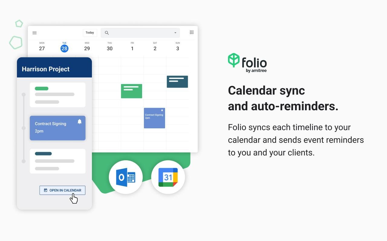 Folio makes it easy to impress your clients and keep your real estate transactions on track – even when you don’t have time. With Folio, real estate agents stay on top of transactions from Gmail and it integrates seamlessly with GSuite and Microsoft 365, and Google or Outlook Calendar.
