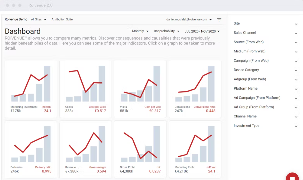 ROIVENUE™ is a marketing intelligence suite built to maximize ROI through data-driven attribution and integration. All your advertising, CRM, and web analytics data in one place. Harness the power of multi-touch attribution to get the most out of your ad spend. The customer journey does not consist of just a single touchpoint. Data-driven attribution enables you to understand the true contribution of each channel. It gives you the datapoints to allocate budgets for maximum performance. Our AI-based predictive model tells you how to reallocate your budget among channels for maximum performance. Depending on your marketing goals, you can optimize advertising channels for profit or revenue,