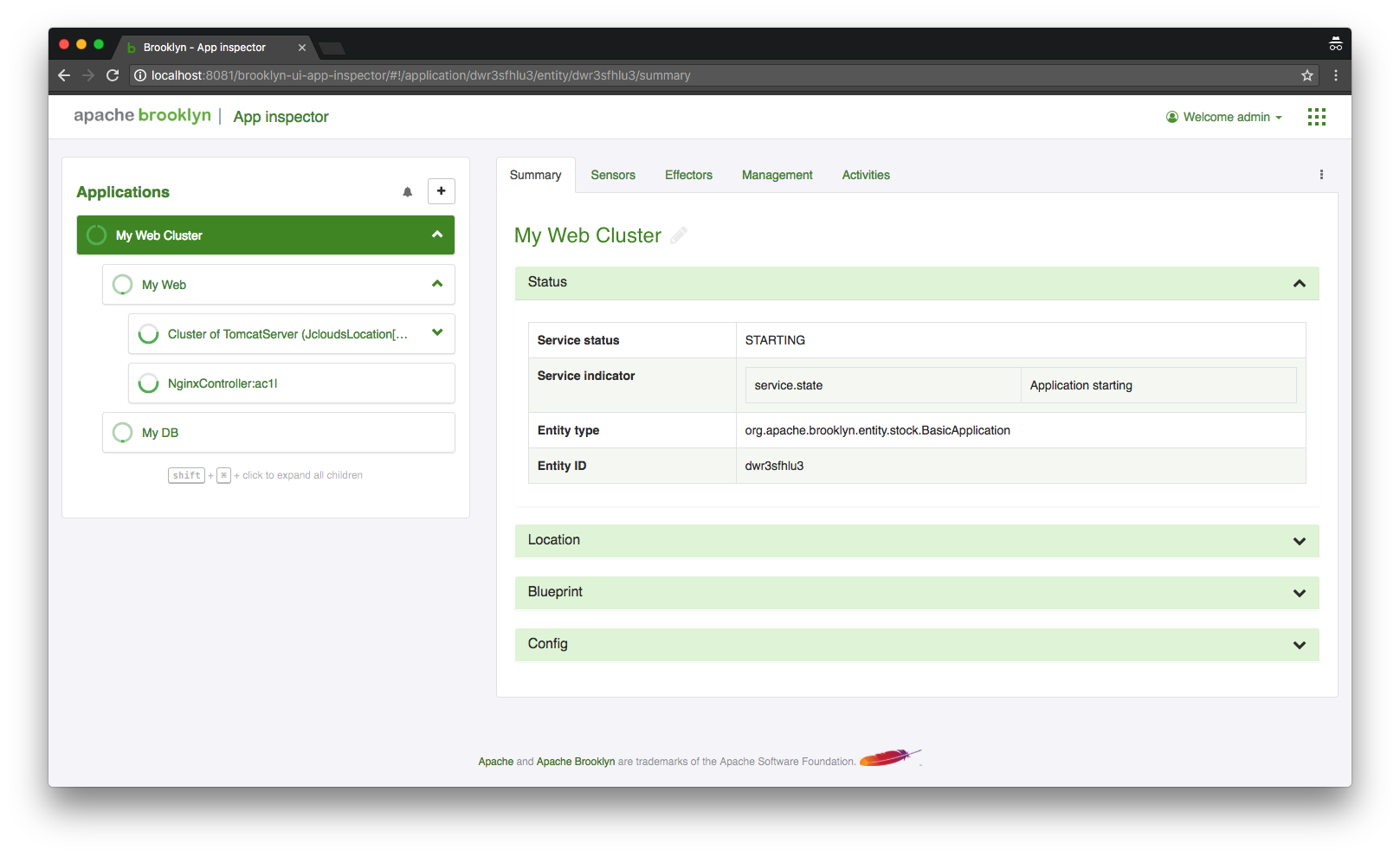 Your applications, any clouds, any containers, anywhere. Apache Brooklyn is software for managing cloud applications. Use it for: Blueprints describe your application, stored as text files in version control, components configured & integrated across multiple machines automatically, 20+ public clouds, or your private cloud or bare servers - and Docker containers, monitor key application metrics; scale to meet demand; restart and replace failed components. View and modify using the web console or automate using the REST API.