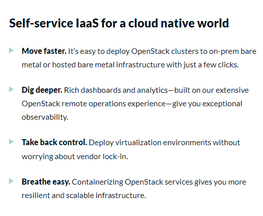 Whether your workloads are restricted to on-prem data centers or you’re battling out-of-control public cloud costs, private cloud virtualization is a crucial piece of your infrastructure puzzle. Mirantis OpenStack for Kubernetes gives you the power of public cloud and the time-tested reliability of OpenStack—all built on a flexible and resilient foundation of Kubernetes, putting you back in control of your cloud. OpenStack is the leading open source private cloud infrastructure-as-a-service (IaaS) framework, providing a feature-rich, mature environment for hosting virtual machines, networks, and storage. Mirantis OpenStack for Kubernetes brings virtualized infrastructure into the cloud native world, providing an easy-to-use virtualization platform built on Kubernetes for optimal flexibility and resilience.