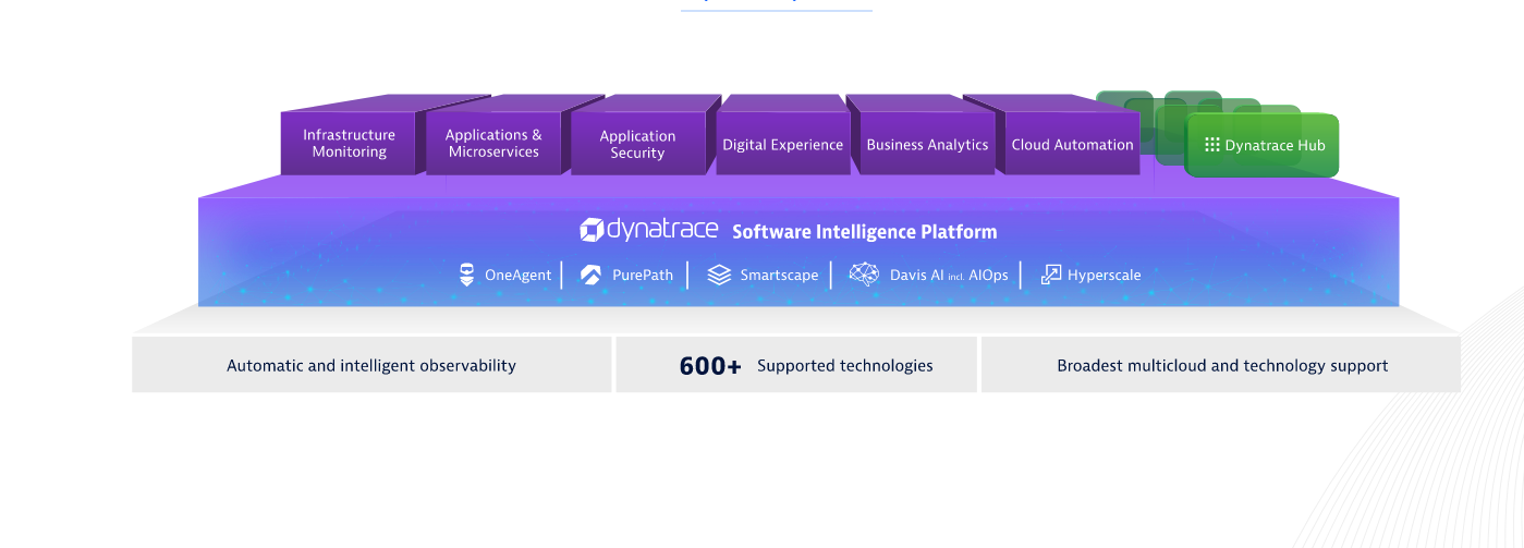 The Dynatrace software intelligence platform. Transform faster with unparalleled observability, automation, and intelligence in one platform. Leave the bag of tools behind, with one platform to automate your dynamic multicloud and align multiple teams. Spark collaboration between biz, dev, and ops with the broadest set of purpose-built use cases in one place. Harness and unify even the most complex dynamic multiclouds, with out-of-the box support for all major cloud platforms and technologies. Get a broader view of your environment. One that includes metrics, logs, and traces, as well as a full topological model with distributed tracing, code-level detail, entity relationships, and even user experience and behavioral data – all in context. Weave Dynatrace’s open API into your existing ecosystem to drive automation in everything from development and releases to cloud ops and business processes.