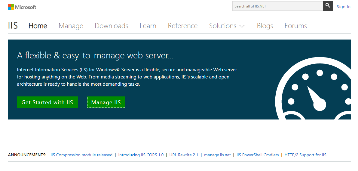 Internet Information Services (IIS) for Windows® Server is a flexible, secure and manageable Web server for hosting anything on the Web. From media streaming to web applications, IIS's scalable and open architecture is ready to handle the most demanding tasks.