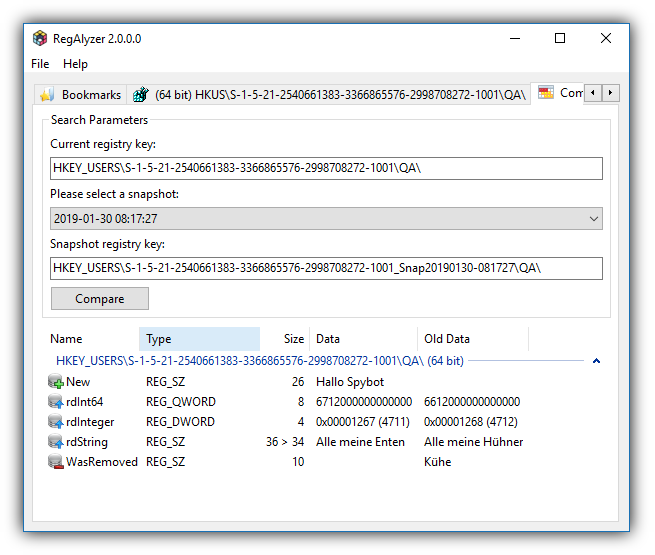 RegAlyzer is a tool to browse and change the registry. It was created because of a few features we missed in the original regedit tool, from support for exotic value types over the background and regular expression search to better bookmarks, displaying .reg files in the accustomed style, and a history view. RegAlyzer 2, currently available as a release candidate, will support a multi-tabbed interface, value interpretations, constant names for values, and snapshots of hives to track changes. RegAlyzer includes a database of some common registry locations including details that help interpret registry values, by providing constant names and descriptive texts. RegAlyzer allows you to track changes to your registry by comparing its current state against snapshots you have made. RegAlyzer 2 brings a new bookmark manager that offers hierarchical storage for bookmarks. RegAlyzer locates inactive hives on other drives and allows you to use the registry inside.