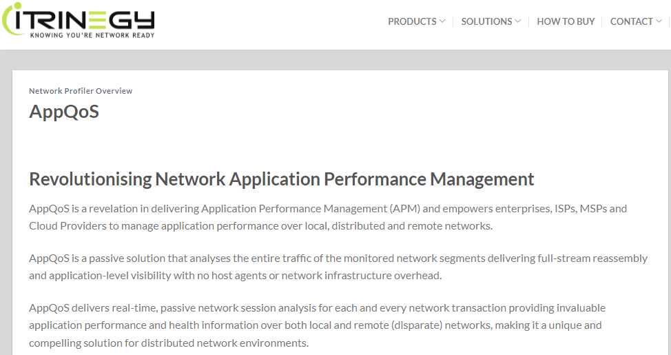 AppQoS is a revelation in delivering Application Performance Management (APM) and empowers enterprises, ISPs, MSPs and Cloud Providers to manage application performance over local, distributed and remote networks. AppQoS is a passive solution that analyses the entire traffic of the monitored network segments delivering full-stream reassembly and application-level visibility with no host agents or network infrastructure overhead. AppQoS delivers real-time, passive network session analysis for each and every network transaction providing invaluable application performance and health information over both local and remote (disparate) networks, making it a unique and compelling solution for distributed network environments. The unmatched deployment and operational flexibility of AppQoS empowers enterprises, ISPs, MSPs and Cloud Providers in the delivery of application performance SLAs across all parts of applicable networked infrastructure.