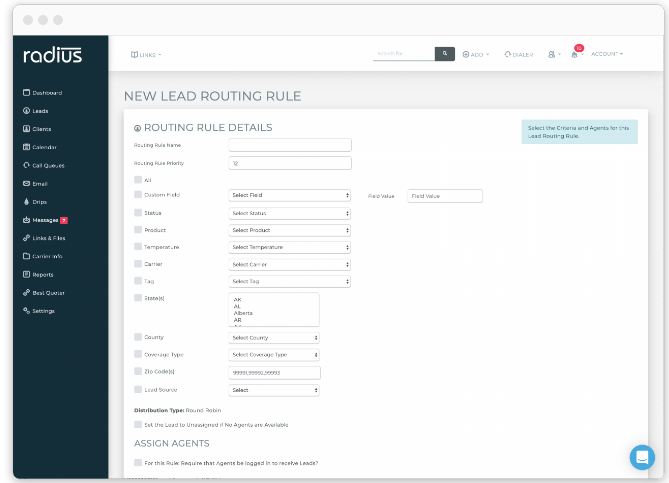 CRM for insurance agencies. Never Lose a Lead or Client again because of misplaced information, hard drive crash, corrupted spreadsheet or a tipped over file cabinet. Organize and Manage all of your Leads & Clients with Radius. An all-in-one Solution for your Agency. No need for a separate email marketing software, use Radius to send Auto Responders, Drip Marketing, Mass Emails & SMS/Text Messages. Every Radius Lead & Client has its own history, reminders & tasks, notes, information, and file storage. Also using the Radius Dropbox helps keep your organized by automatically importing emails. Integrate Radius with how you do Business. Define Custom Form Fields, Lead Temperatures, Client Status and more. Ingrate Radius with your website, quote engine, lead vendor or third party app.