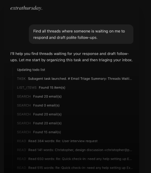 Extra Thursday is an AI-powered inbox assistant that connects to your Gmail and Google Calendar (via OAuth) to transform email management into a fast, context-aware, streamlined workflow. It treats your inbox like a database: it can scan thousands of emails in seconds, extract key insights or open loops, surface important threads, and highlight action items, so you don’t have to manually sort, search, or triage messages. Extra Thursday also drafts professional replies (from polite follow-ups to technical responses), auto-generates follow-up emails, and lets you review/edit before sending, dramatically reducing the time you spend writing and replying. With deep-context AI reading and understanding entire conversations, the platform helps manage email overload and makes your inbox actionable, rather than overwhelming. Privacy-wise, emails and calendar data are only fetched on demand per session; Extra Thursday does not store your full inbox or use your content to train its models.