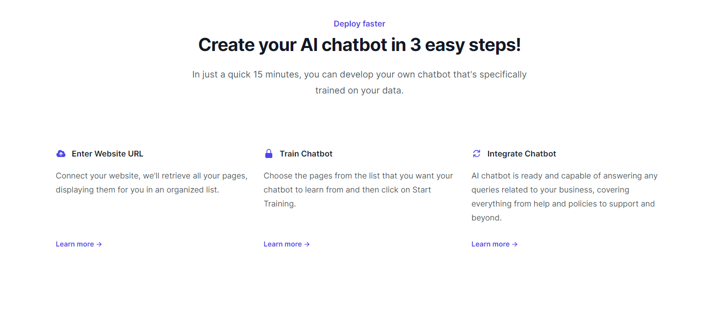 In just a quick 15 minutes, you can develop your own chatbot that's specifically trained on your data. AI chatbot is ready and capable of answering any queries related to your business, covering everything from help and policies to support and beyond. Choose the pages from the list that you want your chatbot to learn from and then click on start training. Connect your website, we'll retrieve all your pages, displaying them for you in an organized list. Reduce your customer support expenses, Recommend and sell with your chatbot and connect with a global audience via multilingual capabilities. Have round-the-clock AI Customer Support on your website, handling complex conversations, remembering previous questions, and adjusting responses. Engages with site visitors, proactively suggesting related topics, upselling and cross-selling products or offering to schedule appointments and collecting details for future follow-ups.