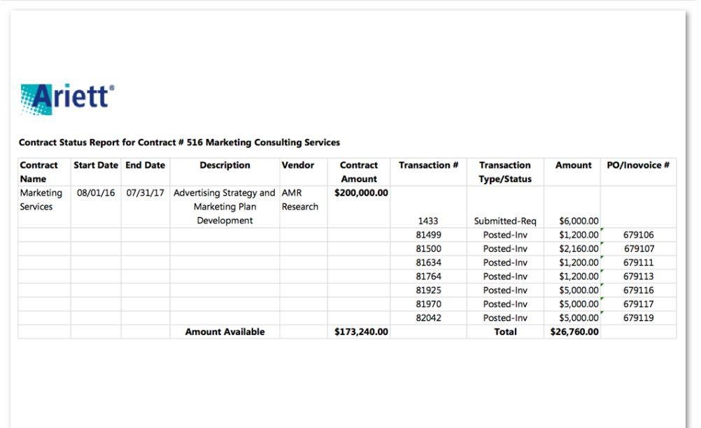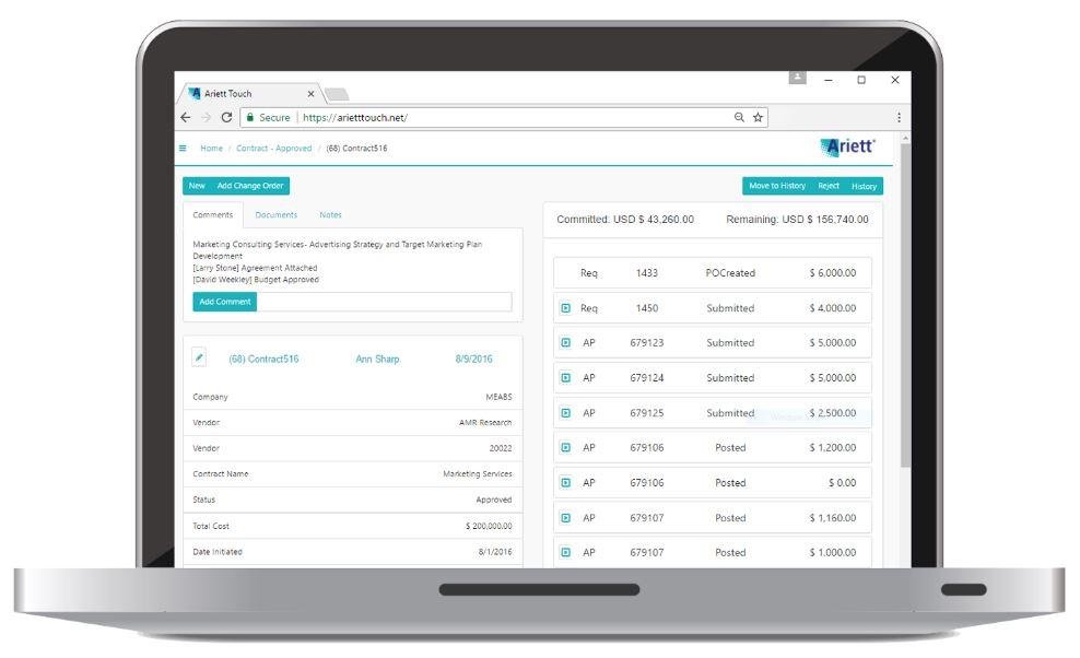 Ariett Contract Management Software is a cloud-based contract tracking solution for vendors agreements and internal capital projects. Simple and web-based, Ariett allows users to request and approve change orders seamlessly as well as tracks terms and view purchase orders and invoices committed to budget in a cost-efficient way. With Ariett, you can simplify approval workflows and proactively view and manage vendor contracts and capital projects from anywhere with the use of any device. Key features include picklists or user-defined fields to track vendor performance, metrics and milestones; search and contract tracking reports; change order tracking with an audit trail, contract or project budget checking; requisition assignments; and more.