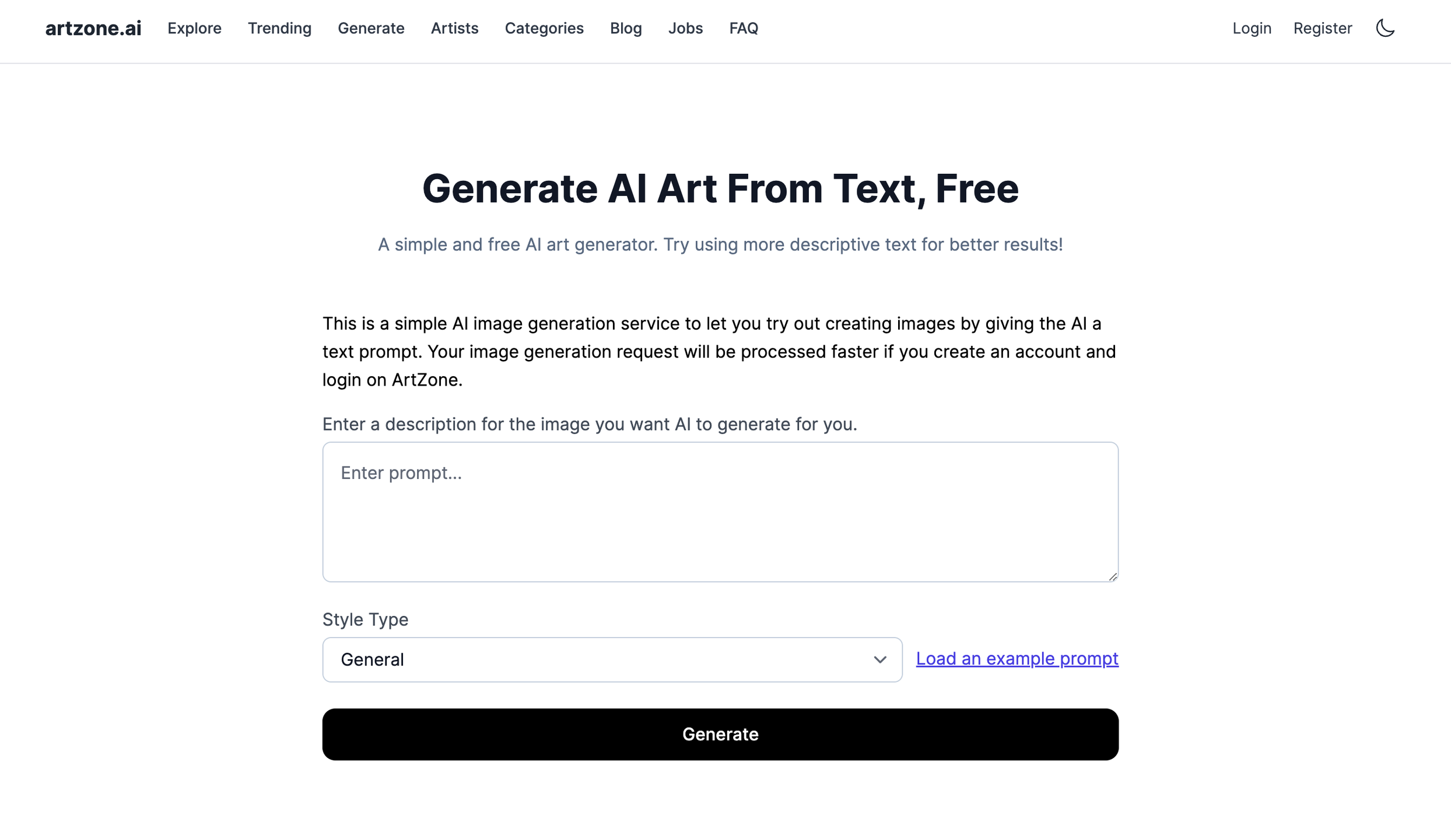 This is a simple AI image generation service to let you try out creating images by giving the AI a text prompt. Your image generation request will be processed faster if you create an account and login on ArtZone.