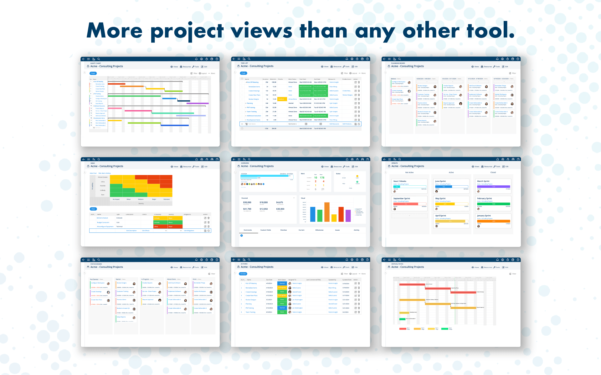 With the most views of any project management platform, teams can keep tabs on assignments, status, risks, resources, capacity, schedules, budgets, and more. Project Insight also offers free view only seats for clients.