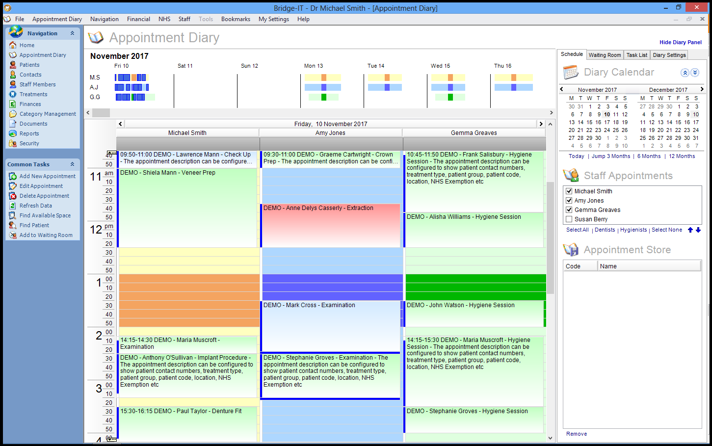 Bridge-IT is a feature-rich and easy to use dental software application designed to help you completely manage your busy dental practice. Book appointments, manage patient records, record treatments and clinical notes, keep tabs on patient finances, oversee staff holidays, create informative reports and much more. It is available for installation either locally on your own “in-house” network, or can be accessed from any location in the cloud by having us host the software for you on our secure cloud servers. Fast, intuitive diary allows you to view and schedule appointments for any provider. Features the ability to drag and drop appointments if the time is changed, colour appointments to represent their status and the ability to instantly find the next available appointment space. Bridge-IT houses it’s own internal word processor, therefore fields within Bridge-IT can be visually merged into your document making it fast and simple to create any letters from within the program.