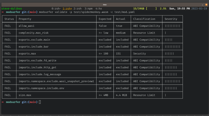 Modsurfer provides ops & dev teams with the first system-of-record and diagnostics application to search, browse, validate, audit, and investigate WebAssembly binaries. At-a-glance insights into WebAssembly module data (code size & complexity, imports/exports & more). Search for details about modules (hash, ID, function names, strings, namespaces, errors & more). Easily audit and track all the WebAssembly code in your stack. Debug & triage issues otherwise difficult to pinpoint in opaque WebAssembly format. Write or generate a "check file" to track binary requirements. If a module fails validation, a helpful report is created to get things back on track. Validate your modules for import/export existence, function signature, security compliance, runtime complexity, & more. The CLI puts all your Modsurfer data at your fingertips and is the easiest way to interact with the Modsurfer desktop or enterprise server.