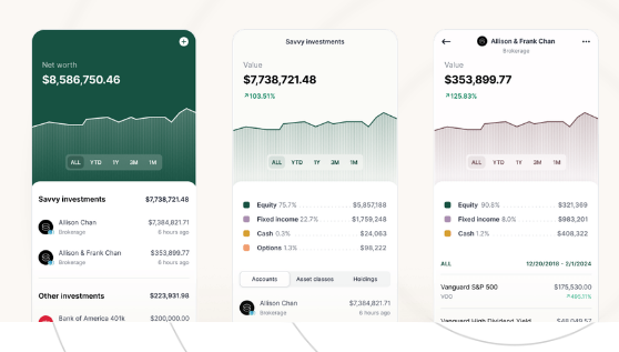 Savvy combines technology with real-world financial expertise to offer you more freedom and peace of mind. We're building technology-driven wealth management to provide a seamless view of your full financial landscape. We're doing it with investment team talent that conducts regular portfolio reviews to assist your advisory team in reaching your financial goals. Our technology streamlines everything from the onboarding process to performance reporting to give your advisor more time to spend directly with you. Savvy's team comprises exceptional and seasoned financial advisors from all across the US. Streamline every aspect of your financial life with client services that deliver a more seamless and efficient experience. Savvy offers a wide range of financial planning services including retirement planning, estate planning, tax strategy, alternative investments, direct indexing, net worth tracking, and the ability to view your accounts with consolidated advice and reporting.