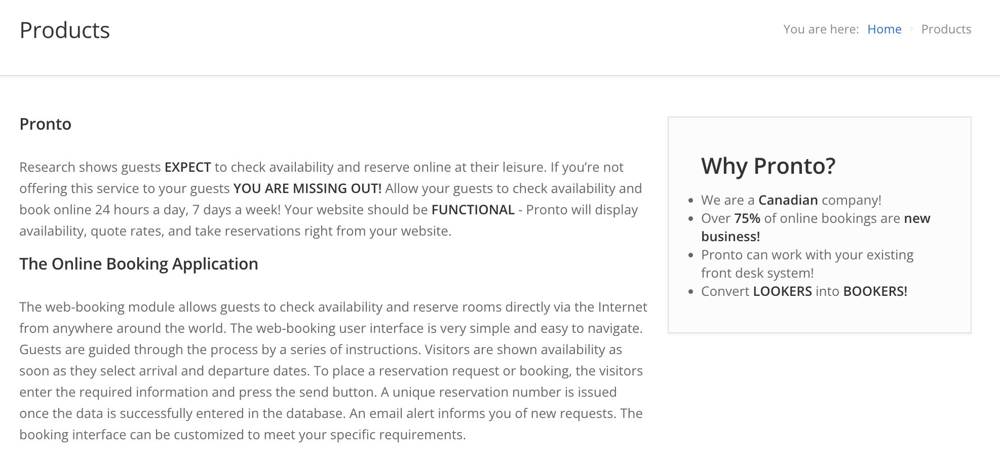 Research shows guests expect to check availability and reserve online at their leisure. If you’re not offering this service to your guests you are missing out! Allow your guests to check availability and book online 24 hours a day, 7 days a week! Your website should be functional - Pronto will display availability, quote rates, and take reservations right from your website. The web-booking module allows guests to check availability and reserve rooms directly via the Internet from anywhere around the world. The web-booking user interface is very simple and easy to navigate. Guests are guided through the process by a series of instructions. Visitors are shown availability as soon as they select arrival and departure dates. To place a reservation request or booking, the visitors enter the required information and press the send button. A unique reservation number is issued once the data is successfully entered in the database. An email alert informs you of new requests.