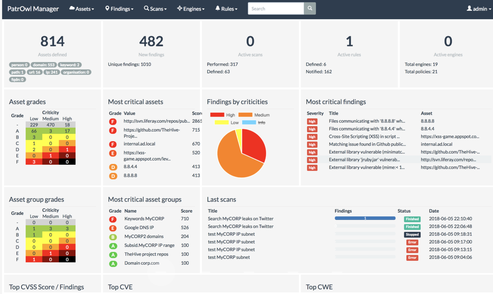 PatrowlHears supports your vulnerability watch process for your internal IT assets (OS, middleware, application, Web CMS, Java/.Net/Node library, network devices, IoT). Vulnerabilities and related exploitation notes at put at your disposal. Scan continuously websites, public IP, domains and subdomains for vulnerabilities, misconfigurations. Perform the reconnaissance steps, including the asset discovery and the full-stack vulnerability assessment and the remediation checks. Automation of static code analysis, external resources assessment and web application vulnerability scans. Access a comprehensive and continuously updated vulnerability database scored and enriched with exploit and threat news information. Metadata are collected and qualified by security experts from public OSINT and private feeds.
