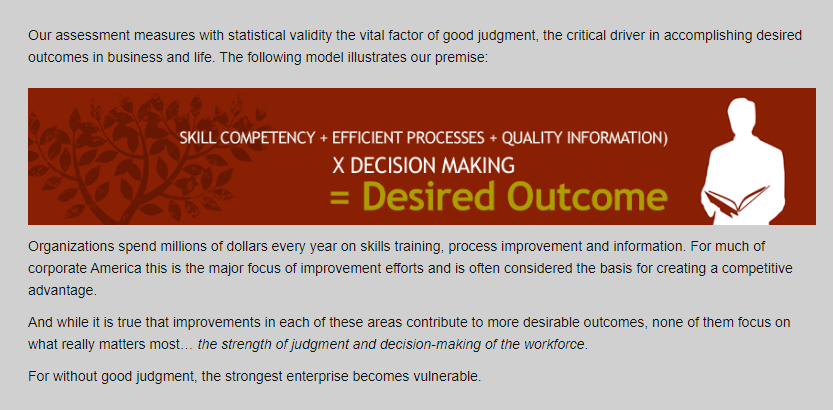 Our assessment measures with statistical validity the vital factor of good judgment, the critical driver in accomplishing desired outcomes in business and life. Our assessment, the Athena Quotient (AQ) is unique among assessments because of its incredible predictability and consistency. But the AQ isn’t so much a test as it is an evaluation. There is no “pass” or “fail.” Prospective employees, current staff and senior leadership do not feel intruded upon, judged or for that matter, tested as they often do with more standard assessment methodologies. The AQ isn’t laborious or intimidating. Most people complete the AQ in less than thirty minutes. We are about the measurement and improvement of judgment—judgment which can produce not simply incremental improvements within an organization, but quantum leaps. Certainly continue training your workforce, but multiply your training efforts with the power of good judgment.