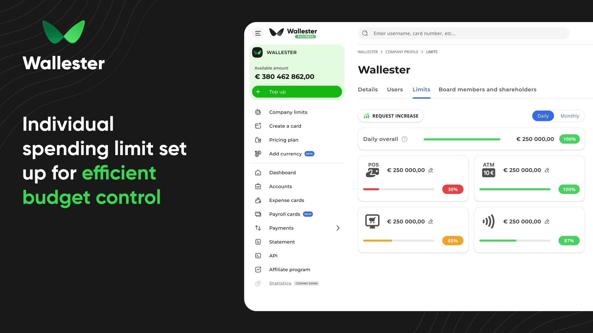 Wallester Business modernises corporate expense management with instant access to virtual and physical Visa cards. Through our app and portal, companies can track expenses, analyse budgets, and integrate seamlessly with accounting systems for better financial control.